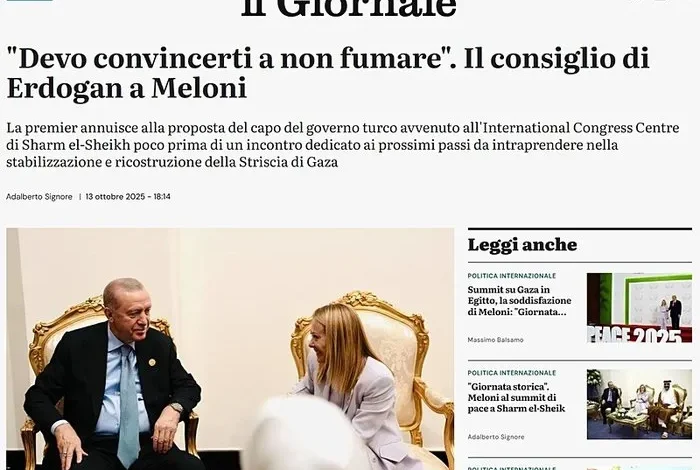 İtalyanı’nın önde gelen gazetelerinden il Giornale, “Erdoğan’dan Meloni’ye tavsiye” başlığıyla haberi duyurdu. Haberde diyaloğun verilmesinin yanı sıra “Meloni, Şarm El-Şeyh Uluslararası Kongre Merkezi’nde Gazze Şeridi’nin istikrarı ve yeniden inşası için atılacak sonraki adımların görüşüleceği toplantı öncesinde Türkiye Başkanı’nın önerisine onay verdi.” denildi.