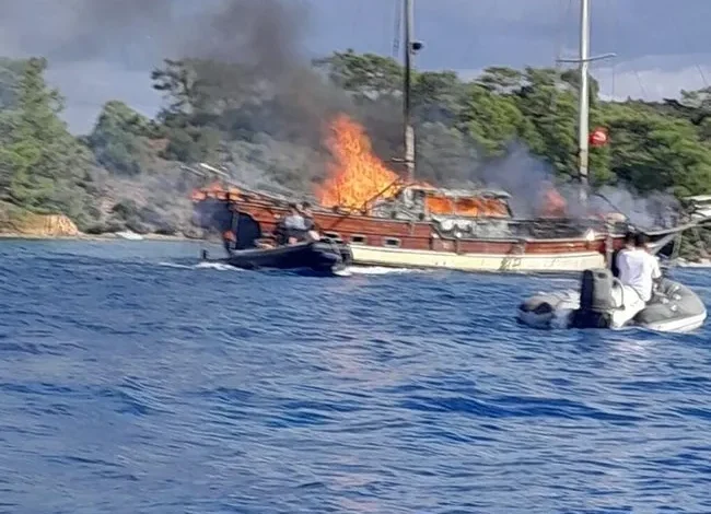 Fethiye ilçesine bağlı Göcek Mahallesi açıklarında Yassıca Adaları mevkiinde bir gulet teknede yangın çıktı.