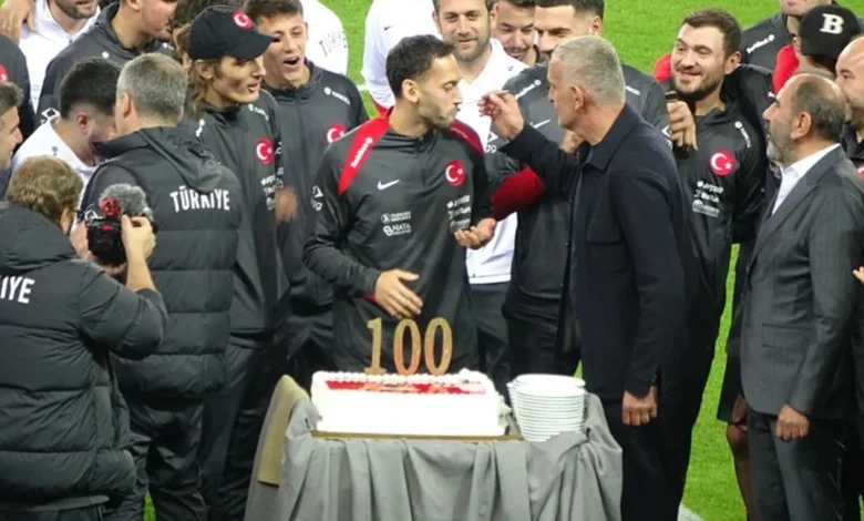 Takım kaptanı Hakan Çalhanoğlu’nun 100. milli maçı için sahanın ortasına pasta getirildi. Türkiye Futbol Federasyonu Başkanı İbrahim Ethem Hacıosmanoğlu, Kocaeli Valisi İlhami Aktaş ve Kocaeli Büyükşehir Belediye Başkanı Tahir Büyükakın da 100. yıl pastası kesilirken milli futbolcuyu yalnız bırakmadı.