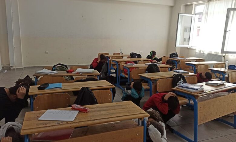 Kentteki okullarda Sivil Savunma, MEB AKUB ve İş Yeri Sağlık ve Güvenlik Birimlerinin koordinesinde düzenlenen tatbikatlarda öğrenciler, senaryo gereği siren sesiyle “çök, kapan, tutun” hareketi yaptı.
