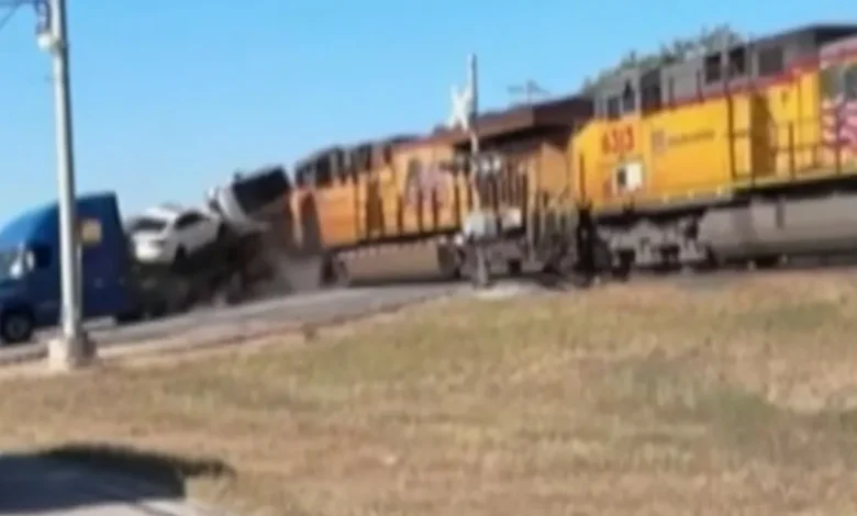 ABD’nin Texas eyaletine bağlı Schertz şehrinde araç taşıyan tır, hemzemin geçitte mahsur kaldı.
