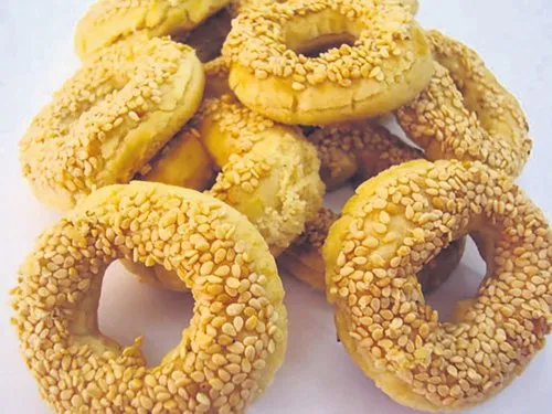 YAPILIŞI: Yumurta akı dışındaki tüm malzemeleri bir kaba koyup şekil verecek kıvama gelinceye kadar yoğuruyoruz. Daha sonra hamurdan parçalar koparıp şekillendiriyoruz. Üste gelecek kısmını, önce ayırdığımız yumurta akına, sonra ise bir tabağa koyduğumuz susama batırıyoruz ve tepsiye diziyoruz. 160 derecede önceden ısıtılmış fırında üzeri kızarana kadar pişiriyoruz.