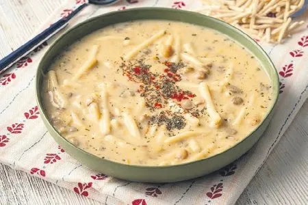 YAPILIŞI: Öncelikle küçük bir kapta mercimekler haşlanır. Tencereye yoğurt, un, makarna ve haşlanan mercimek eklenip orta ateşte sürekli karıştırılır. Tuz ve bulyon da eklenip karıştırılmaya devam edilir. Karışım kaynayınca karıştırmaya gerek yoktur. 2 bardak su ekleyip tekrar kaynatılır. Bu sırada bir tavada yemeklik doğranmış soğan kavrulur ve kırmızı biber, kekik, salça eklenip kavurmaya devam edilir. Daha sonra bu karışım kaynayan çorbaya eklenip bir taşım kaynatılır.