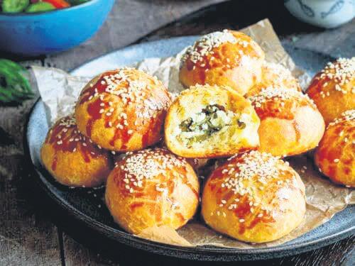 YAPILIŞI: Karıştırma kabına sıvı yağ, yoğurt ve yumurta akını alıp karıştırıyoruz. Biraz un, kabartma tozları, tuz, şeker ve sirke ilave edip tekrar karıştırıyoruz. Kalan unu azar azar ekleyerek yumuşak bir hamur yoğuruyoruz. Hamurdan mandalinadan biraz büyük bezeler koparıp yuvarlıyoruz ve iç malzemesini koyup kapatıyoruz. Üzerine yumurta sarısı ve susam serperek 200 derece fırında kızarana kadar pişiriyoruz.