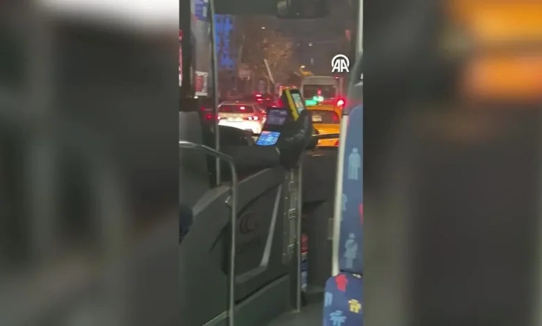 Seyir halindeki “622-Yenidoğan-Mecidiyeköy” seferini yapan otobüsün şoförü, sağ ayağını validatör cihazının bulunduğu bölüme uzattı.