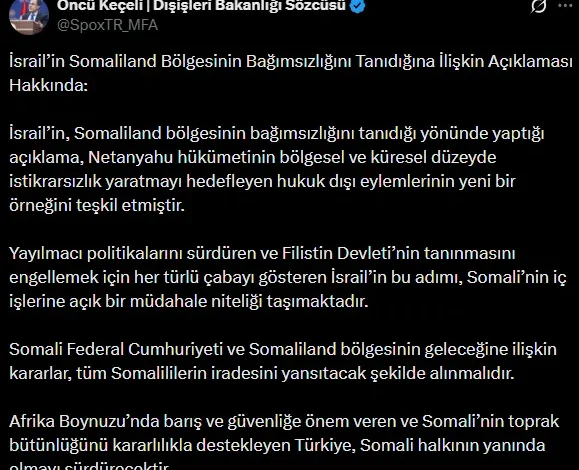 Dışişleri Bakanlığı Sözcüsü Öncü Keçeli, sosyal medya platformundaki hesabından konuya ilişkin değerlendirmede bulundu. “İsrail’in, Somaliland bölgesinin bağımsızlığını tanıdığı yönünde yaptığı açıklama, (İsrail Başbakanı Binyamin) Netanyahu hükümetinin bölgesel ve küresel düzeyde istikrarsızlık yaratmayı hedefleyen hukuk dışı eylemlerinin yeni bir örneğini teşkil etmiştir.” ifadesini kullanan Keçeli yayılmacı politikalarını sürdüren ve Filistin Devleti’nin tanınmasını engellemek için her türlü çabayı gösteren İsrail’in bu adımının Somali‘nin iç işlerine açık bir müdahale niteliği taşıdığını vurguladı. Keçeli, Somali Federal Cumhuriyeti ve Somaliland bölgesinin geleceğine ilişkin kararların, tüm Somalililerin iradesini yansıtacak şekilde alınması gerektiğinin altını çizerek, Türkiye‘nin Afrika Boynuzu’nda barış ve güvenliğe önem verdiğini hatırlattı. Dışişleri Sözcüsü ayrıca, Ankara’nın Somali’nin toprak bütünlüğünü “kararlılıkla desteklediğini” kaydederek, Somali halkının yanında olmanın sürdürüleceği mesajını verdi.