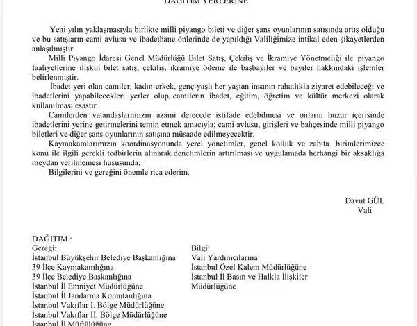 İstanbul Valiliğinden milli piyango bileti satışına yönelik genelge yayımlandı. Genelgede, yeni yılın yaklaşmasıyla birlikte milli piyango bileti ve diğer şans oyunlarının satışında artış olduğu ve bu satışların cami avlusu ve ibadethane önlerinde de yapıldığının Valiliğe intikal eden şikayetlerden anlaşıldığı belirtildi. Milli Piyango İdaresi Genel Müdürlüğü Bilet Satış, Çekiliş ve İkramiye Yönetmeliği ile piyango faaliyetlerine ilişkin bilet satış, çekiliş, ikramiye ödeme ile başbayiler ve bayiler hakkındaki işlemlerin belirlendiğinin ifade edildiği genelgede, “İbadet yeri olan camiler, kadın-erkek, genç-yaşlı her yaştan insanın rahatlıkla ziyaret edebileceği ve ibadetlerini yapabilecekleri yerler olup, camilerin ibadet, eğitim, öğretim ve kültür merkezi olarak kullanılması esastır.