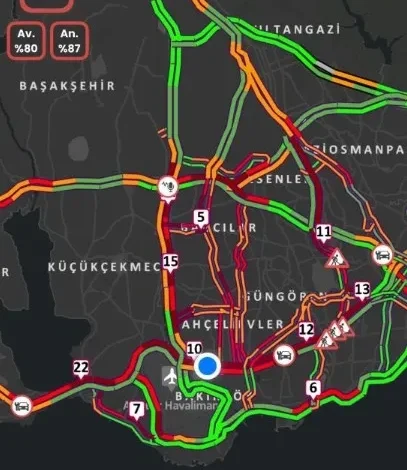 İstanbul Büyükşehir Belediyesi Trafik Yoğunluğu Haritası verilerine göre trafik yoğunluğu saat 18.26 itibariyle yüzde 81 olarak ölçüldü. E-5 Karayolu ve ana arterlerde araçlar ilerlemekte zorlanırken uzun araç kuyrukları oluştu.