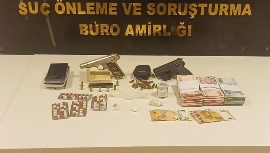 Şüphelilerin üst ve ikametlerinde yapılan aramalarda ruhsatsız 2 tabanca ve bu silahlara ait 35 fişek, 49 sentetik ecza hap, 91 gram sentetik uyuşturucu ve suçtan elde edildiği değerlendirilen 178 bin 900 lira ele geçirildi.