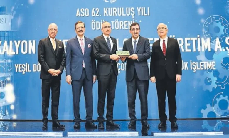 Ankara Sanayi Odası (ASO) 62. Kuruluş Yılı Ödül Töreni, Cumhurbaşkanı Yardımcısı Cevdet Yılmaz’ın katılımıyla gerçekleşti. Gecede ödüllendirilen 28 şirket arasında, Kalyon Güneş Teknolojileri Üretim A.Ş. de yer aldı. “Yeşil Dönüşüm Kapasitesini En Çok Geliştiren Büyük İşletme” kategorisinde verilen ödülü, Kalyon PV CEO’su İhsan Kulalı aldı.