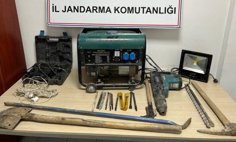 Olay yerinde 1 adet jeneratör, 2 adet delici, 12 adet delici ucu ve 8 adet muhtelif kazı malzemesi ele geçirildi.