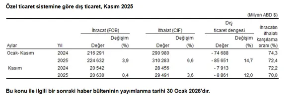 Özel ticaret sistemine göre, 2025 yılı Kasım ayında, ihracat bir önceki yılın aynı ayına göre %0,4 artarak 20 milyar 630 milyon dolar, ithalat %3,6 artarak 29 milyar 491 milyon dolar olarak gerçekleşti.