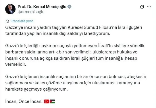 Memişoğlu, NSosyal hesabından yaptığı paylaşımda İsrail’in Küresel Sumud Filosu’na saldırısını lanetleyen Memişoğlu, şunları kaydetti: