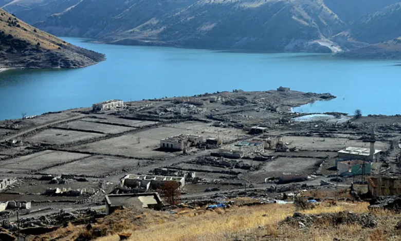 Kars’ın Sarıkamış ilçesindeki Karakurt HES Barajı’nda su seviyesinin düşmesiyle daha önce sular altında kalan köy evleri ve tarihi binalar tekrar gün yüzüne çıktı.
