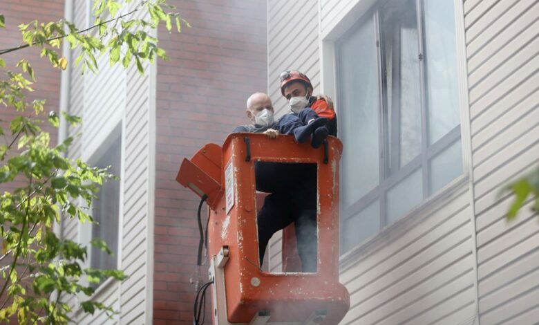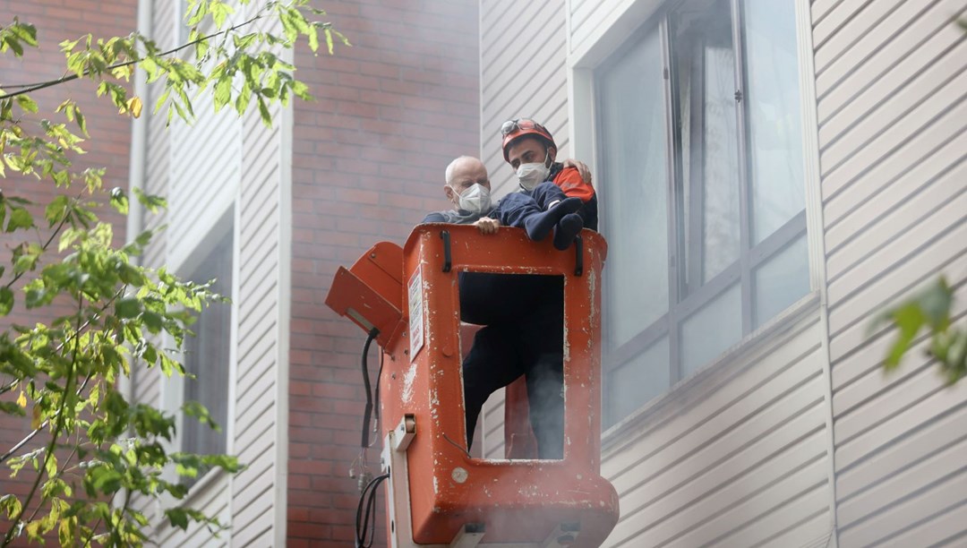 İtfaiye ekipleri binanın üst katında mahsur kalan vatandaşları merdivenli araçlarla tahliye etti.