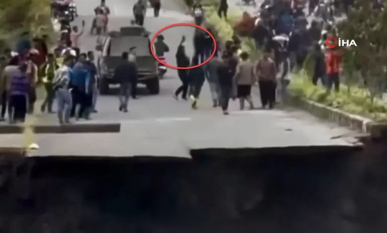 Görüntüler Endonezya’da kayda geçti. Sel ve heyelanların 770 can aldığı bölgede facianın eşiğinden dönüldü. Üzerinde araçların ve insanların olduğu yolun çöktüğü o anları izleyenlerin kanı dondu. Kaçan insanlar bir yandan da o anları telefonlarıyla kaydetmeye çalıştı.