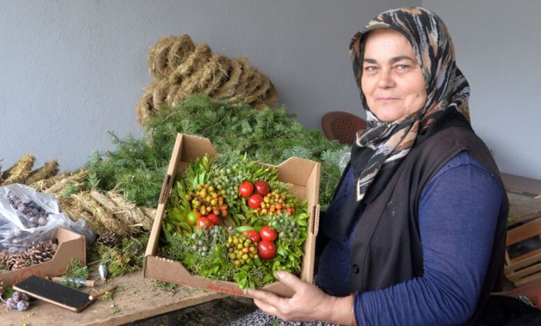 Evlerin çoğunluğu çelenk üretim atölyesine dönüyor. Beldedeki 3 ihracatçı firma tarafından özel izinle ormandan ücret karşılığı toplanan ürünler, her sabah çelenk yapan köylü kadınların evlerinin önüne bırakılıyor. Kadınlar bir taraftan çelenk yapıp para kazanırken, diğer taraftan ev işleriyle uğraşıyor. Akşamları da yapılan çelenkler toplanıp, depodaki paketleme işleminin ardından TIR ile Avrupa’ya gönderiliyor.
