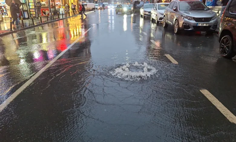 Kentte etkili olan şiddetli yağış nedeniyle Halkalı Caddesi’nde rögar taştı. Cadde sular altında kalırken, sürücüler yolda ilerlemekte güçlük çekti.