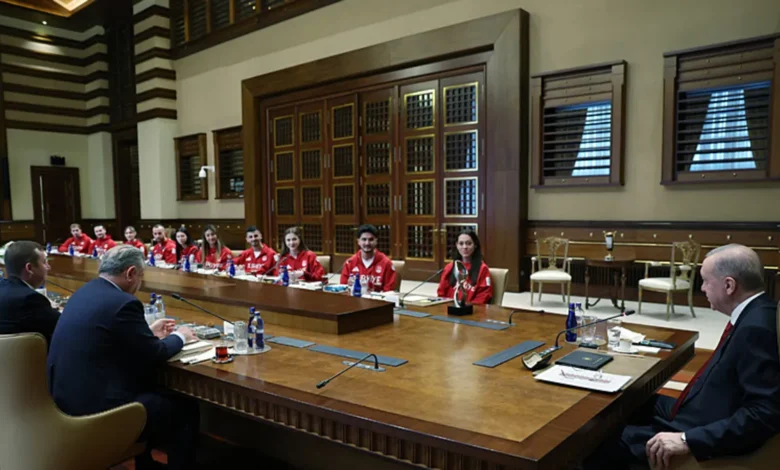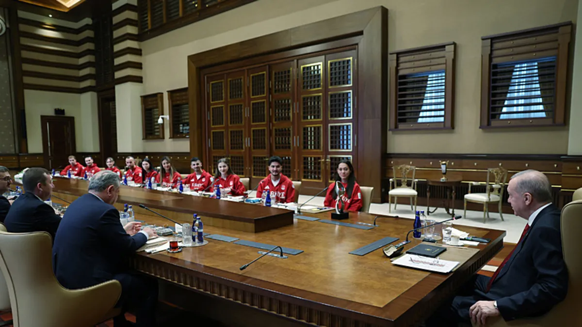 Başkan Recep Tayyip Erdoğan, çeşitli branşlardan başarılı sporcuları Cumhurbaşkanlığı Külliyesi’nde kabul etti. Türkiye’nin sporda küresel ölçekte daha üst seviyelere çıkması için çalışmaların sürdüğünü belirten Başkan Erdoğan, ‘Diğer alanlarda olduğu gibi, sporda da Türkiye Yüzyılı hedeflerimize ulaşmak için büyük bir çaba harcıyoruz’ dedi. İşte kare kare o anlar…