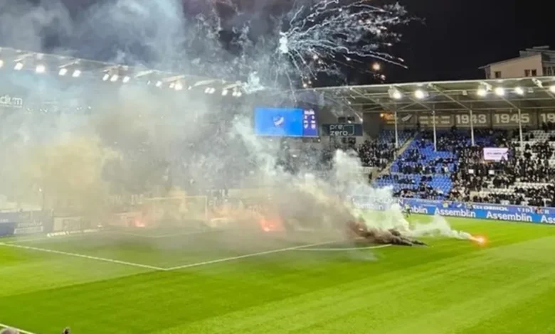 İlk maçı 3-0 kaybeden Norrköping’in sahasında oynanan rövanş mücadelesinde, takımlarının küme düşmesine tepki gösteren ev sahibi ekibin taraftarları 85. dakikada suni çim zemine yanıcı madde atmaya başladı.
