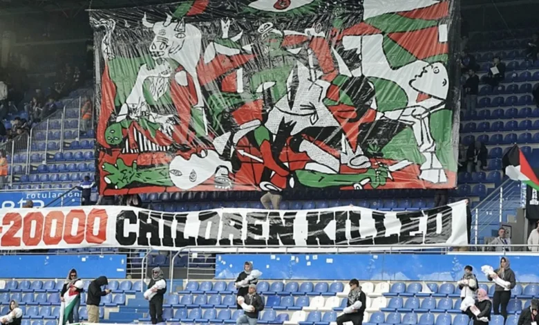 Bask bölgesinin kulüpleri Osasuna, Athletic Bilbao ve Alaves’in taraftarları, tribünleri Filistin bayrakları ve İsrail’i protesto eden pankartlarla doldurdu.