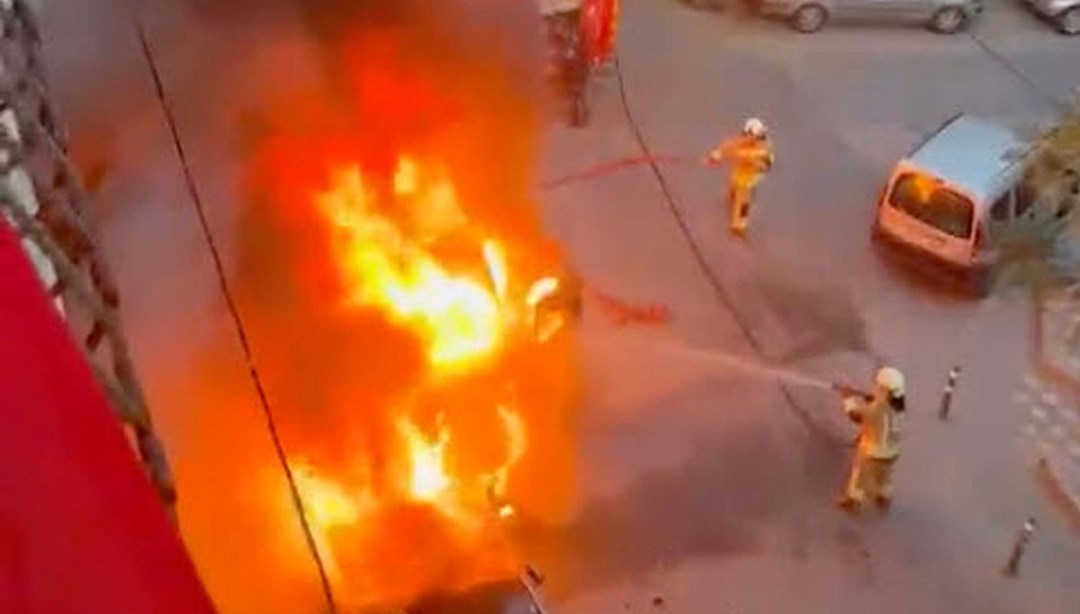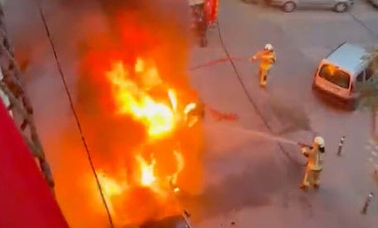 Kısa sürede büyüyen alevler, park halindeki elektrikli otomobile sıçradı.