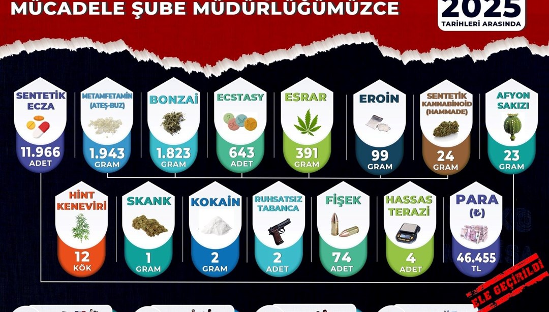 Yapılan operasyonlarda; 11 bin 966 sentetik ecza (hap), bin 943 gram metamfetamin, bin 823 gram sentetik kannabinoid (bonzai), 643 ecstasy hap, 391 gram esrar, 99 gram eroin, 24 gram sentetik kannabinoid hammaddesi, 23 gram afyon sakızı, 12 kök hint keneviri, 1 gram skank, 2 gram kokain, 2 ruhsatsız tabanca, 74 fişek, 4 hassas terazi ve uyuşturucu madde ticaretinden elde edildiği değerlendirilen 46 bin 455 TL para ele geçirildi.