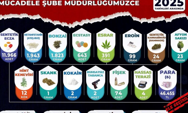 Yapılan operasyonlarda; 11 bin 966 sentetik ecza (hap), bin 943 gram metamfetamin, bin 823 gram sentetik kannabinoid (bonzai), 643 ecstasy hap, 391 gram esrar, 99 gram eroin, 24 gram sentetik kannabinoid hammaddesi, 23 gram afyon sakızı, 12 kök hint keneviri, 1 gram skank, 2 gram kokain, 2 ruhsatsız tabanca, 74 fişek, 4 hassas terazi ve uyuşturucu madde ticaretinden elde edildiği değerlendirilen 46 bin 455 TL para ele geçirildi.