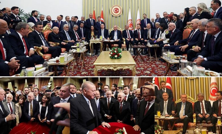 Meclis Başkanı Numan Kurtulmuş’un ev sahipliği yaptığı resepsiyona, Cumhurbaşkanı Recep Tayyip Erdoğan, MHP Genel Başkanı Devlet Bahçeli, DEM Parti Eş Genel Başkanları Tülay Hatimoğulları ve Tuncer Bakırhan ile bakanlar katıldı.