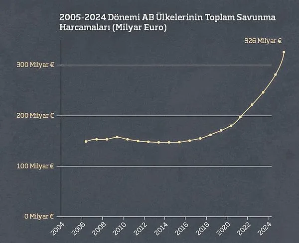 2014’de 147 milyar euro olan AB savunma harcamalarının 2024’te 325 milyar euro’ya ulaştığı görülüyor.