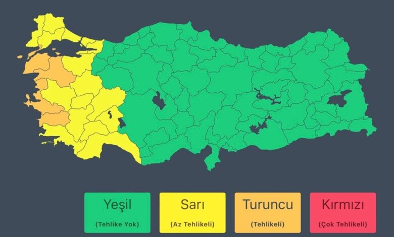 Meteorolojinin yanı sıra İçişleri Bakanlığı da Sakarya ve Bilecik dışında Marmara Bölgesi’nde kuvvetli; Muğla, Aydın kıyıları, İzmir’in kuzey ve güney ilçeleri ile Çanakkale ve Balıkesir’in batısında çok kuvvetli sağanak beklendiği uyarısı yaptı.