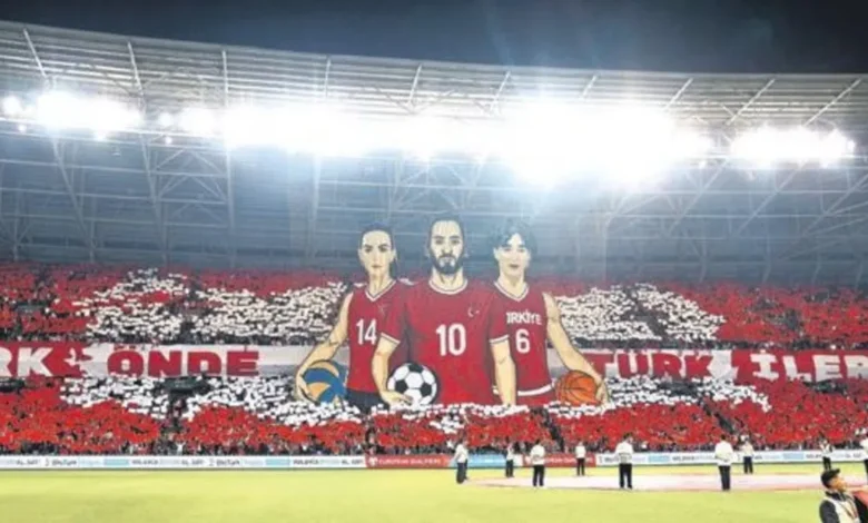 Kocaeli Stadyumu’nda Gürcistan ile oynanan kritik karşılaşmada tribünler tamamen doldu. Hodri Meydan tribününde gerçekleştirilen koreografide kırmızı-beyaz renklerdeki Türkiye haritası üzerinde A Milli Kadın Voleybol Takımı Kaptanı Ede Erdem, A Milli Erkek Futbol Takımı Kaptanı Hakan Çalhanoğlu ve A Milli Erkek Basketbol Takımı Kaptanı Cedi Osman’ın görselleri 3 boyutlu yapıldı. Ayrıca görsellerin altında bulunan pankartta da ‘Türk önde Türk ileri’ yazısı yer aldı.