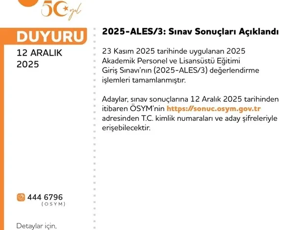 ÖSYM tarafından yayımlanan 2025 sınav takvimine göre, 23 Kasım’da gerçekleştirilen 2025-ALES/3 oturumunun sonuçları 12 Aralık 2025 Cuma günü (bugün) itibarıyla erişime açıldı.