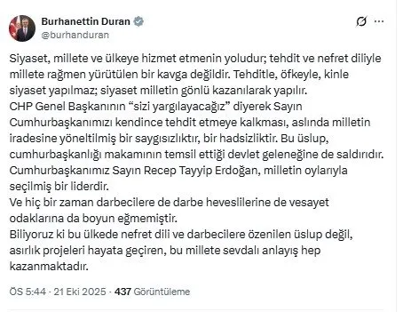 “CHP Genel Başkanının ‘sizi yargılayacağız’ diyerek Sayın Cumhurbaşkanımızı kendince tehdit etmeye kalkması, aslında milletin iradesine yöneltilmiş bir saygısızlıktır, bir hadsizliktir. Bu üslup, cumhurbaşkanlığı makamının temsil ettiği devlet geleneğine de saldırıdır. Cumhurbaşkanımız Sayın Recep Tayyip Erdoğan, milletin oylarıyla seçilmiş bir liderdir.