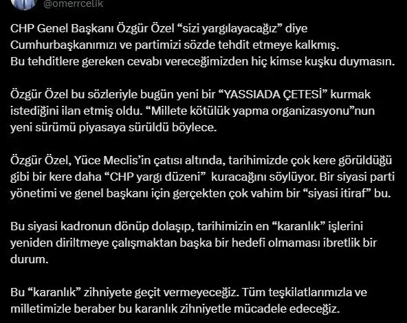 AK Parti Sözcüsü Ömer Çelik yaptığı paylaşımda “CHP Genel Başkanı Özgür Özel “sizi yargılayacağız” diye Cumhurbaşkanımızı ve partimizi sözde tehdit etmeye kalkmış. Bu tehditlere gereken cevabı vereceğimizden hiç kimse kuşku duymasın. Özgür Özel bu sözleriyle bugün yeni bir “YASSIADA ÇETESİ” kurmak istediğini ilan etmiş oldu. “Millete kötülük yapma organizasyonu”nun yeni sürümü piyasaya sürüldü böylece. Özgür Özel, Yüce Meclis’in çatısı altında, tarihimizde çok kere görüldüğü gibi bir kere daha “CHP yargı düzeni” kuracağını söylüyor. Bir siyasi parti yönetimi ve genel başkanı için gerçekten çok vahim bir “siyasi itiraf” bu. Bu siyasi kadronun dönüp dolaşıp, tarihimizin en “karanlık” işlerini yeniden diriltmeye çalışmaktan başka bir hedefi olmaması ibretlik bir durum. Bu “karanlık” zihniyete geçit vermeyeceğiz. Tüm teşkilatlarımızla ve milletimizle beraber bu karanlık zihniyetle mücadele edeceğiz.” ifadelerini kullandı.