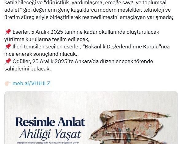 Milli Eğitim Bakanlığı “”Resimle Anlat, Ahiliği Yaşat” konulu resim yarışmasıyla ilgili bilgilendirmede bulundu. Öğrenciler yarışmaya gönüllülük esasına göre ve ücretsiz katılabilecek. Her öğrenci yalnızca bir eserle yarışmaya başvurabilecek. Yarışmaya katılmak isteyen öğrenciler, çalışmalarını 5 Aralık 2025 tarihine kadar okullarında oluşturulacak yürütme kurullarına teslim edecek.