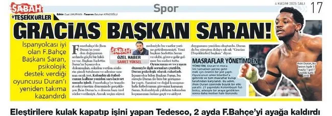 Beşiktaş maçında 66. dakikada oyuna giren, 83’te kendi çabası ile galibiyet golünü atan Jhon Duran, dün yapılan idmanda basının sorularını yanıtladı. SABAH Spor’un ‘GRACIAS (TEŞEKKÜRLER) BAŞKAN SARAN’ başlığıyla dün manşetine taşıdığı iyileşme süresinde Sadettin Saran faktörünün önemi haberi birinci ağızdan belgelendi. Golcü futbolcu, “Uzun bir sakatlıktı. Her futbolcu takımına katkı sağlamak, bir an önce oynamak ister. Başkanımız tüm sakatlık süreci boyunca yanımda oldu, eşlik etti. Benimle konuştu. Bu süreci atlatmamda en büyük yardımcımdı” diye konuştu.