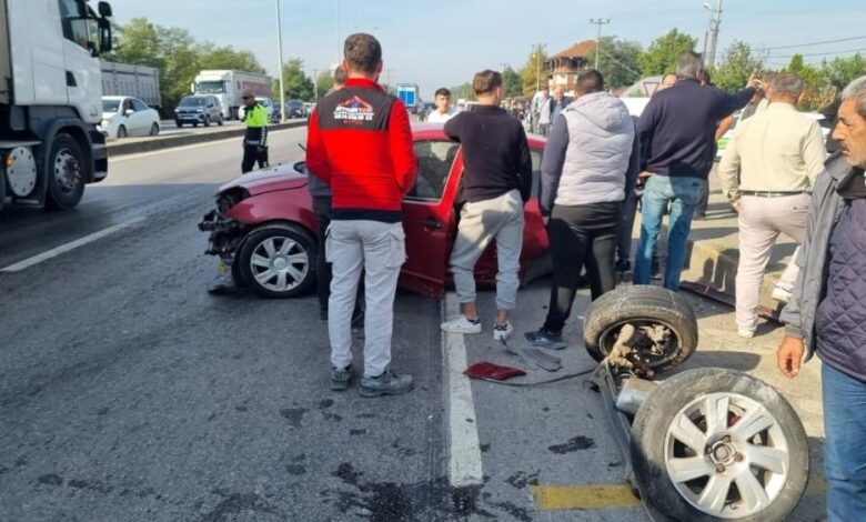 Çarpışmanın şiddetiyle savrulan araçlarda büyük hasar oluşurken, otomobilin arka tekerleri aksıyla birlikte koparak yol ortasına fırladı.