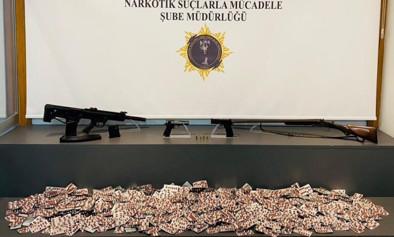 Adreslerde yapılan aramada 10 bin 192 sentetik ecza hapı, iki ruhsatsız tabanca ile iki ruhsatsız tüfek ele geçirildi.