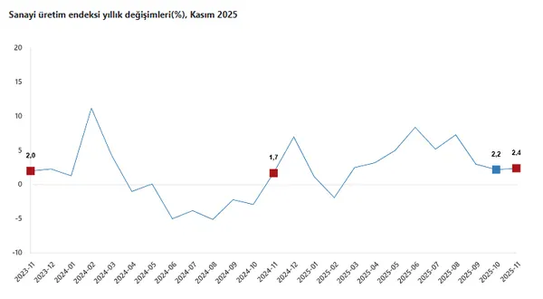 Sanayinin alt sektörleri (2021=100 referans yıllı) incelendiğinde, 2025 yılı Kasım ayında madencilik ve taş ocakçılığı sektörü endeksi bir önceki yılın aynı ayına göre yüzde 0,2 arttı, imalat sanayi sektörü endeksi yüzde 2,7 arttı ve elektrik, gaz, buhar ve iklimlendirme üretimi ve dağıtımı sektörü endeksi yüzde 2,0 azaldı.