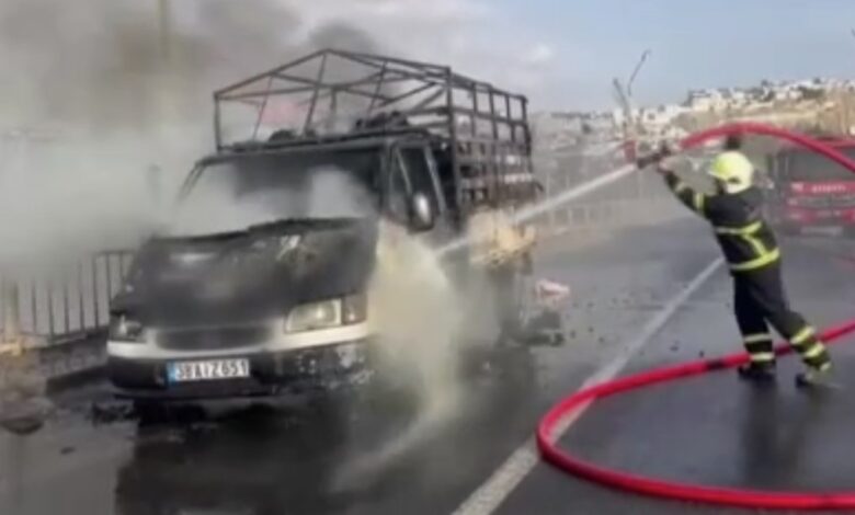Şanlıurfa’nın Birecik ilçesinde Fırat Nehri üzerindeki Birecik Köprüsü’nde Mehmet A.’nın kullandığı tekstil malzemesi yüklü kamyonetin arka kısmından alevler yükseldi.