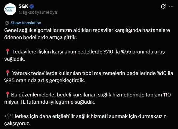 Yapılan paylaşımda, “Tedavilere ilişkin karşılanan bedellerde yüzde 10 ila yüzde 55 oranında artış sağladık. Yatarak tedavilerde kullanılan tıbbi malzemelerin bedellerinde yüzde 10 ila yüzde 85 oranında artış gerçekleştirdik. Bu düzenlemelerle, bedeli karşılanan sağlık hizmetlerinde toplam 110 milyar lira tutarında iyileştirme sağladık. Herkes için daha erişilebilir sağlık hizmeti sunmak için durmaksızın çalışıyoruz.” ifadelerine yer verildi.