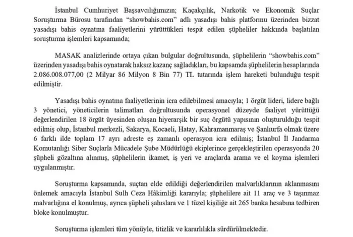 Başsavcılıktan yapılan açıklama şöyle: “İstanbul Cumhuriyet Başsavcılığımızın; Kaçakçılık, Narkotik ve Ekonomik Suçlar Soruşturma Bürosu tarafından “showbahis.com” adlı yasadışı bahis platformu üzerinden bizzat yasadışı bahis oynatma faaliyetlerini yürüttükleri tespit edilen şüpheliler hakkında başlatılan soruşturma işlemleri kapsamında; MASAK analizlerinde ortaya çıkan bulgular doğrultusunda, şüphelilerin “showbahis.com” üzerinden yasadışı bahis oynatarak haksız kazanç sağladıkları, bu kapsamda şüphelilerin hesaplarında 2.086.008.077,00 (2 Milyar 86 Milyon 8 Bin 77) TL tutarında işlem hareketi bulunduğu tespit edilmiştir.
