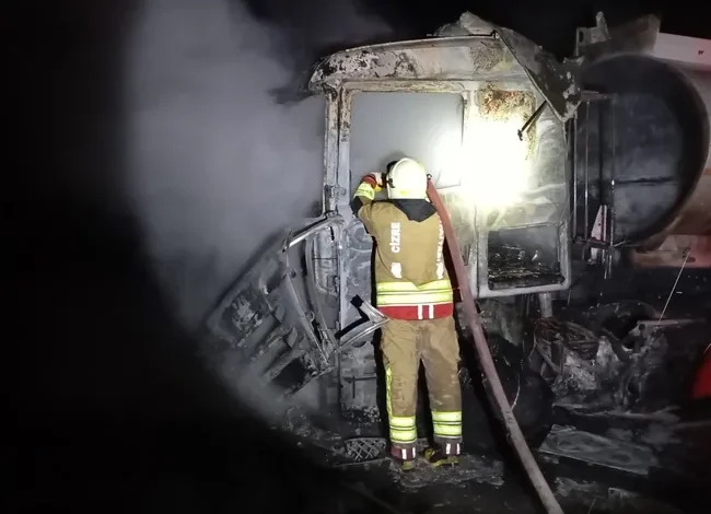 Nusaybin’den Cizre yönüne seyreden sürücüsü ve plakası öğrenilemeyen tır, İdil’e bağlı Okçu köyü mevkiinde bilinmeyen nedenden yanmaya başladı. Kısa sürede büyüyen yangını fark eden sürücü, aracı yol kenarına çekip itfaiyeyi aradı.