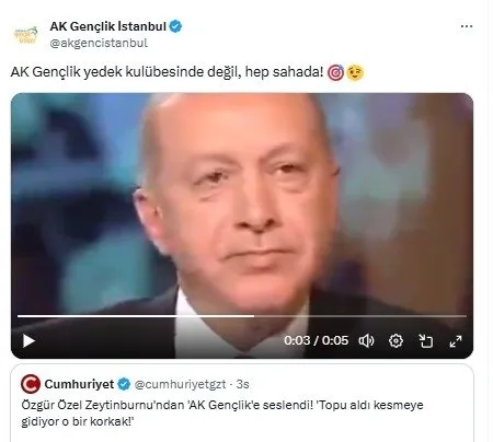 Özel’in AK Gençlik’e yönelik “Topu aldı kesmeye gidiyor o bir korkak!” sözlerine de AK Parti İstanbul Gençlik Kolları Başkanlığı tarafından yapılan paylaşımla “AK Gençlik yedek kulübesinde değil, hep sahada!” yanıtı verildi.