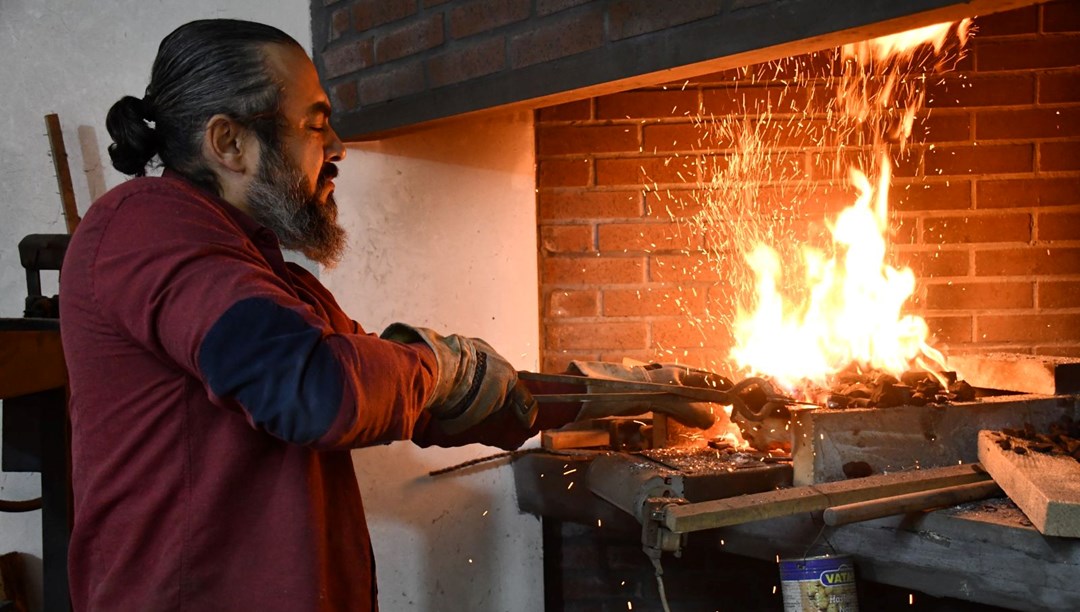 “İlk önce çeliği kesiyoruz. Daha sonra ateşte bıçağın şeklini verip döverek sertlik kazandırıyoruz. Ardından sulamasını yapıyoruz. Tarihi gözükmesi açısından bıçağın yüzeyine herhangi bir parlatma yapmıyoruz. Böylece dövme formunu koruyoruz. Sapını yapıp pimlerini çaktıktan sonra son haline geliyor.”