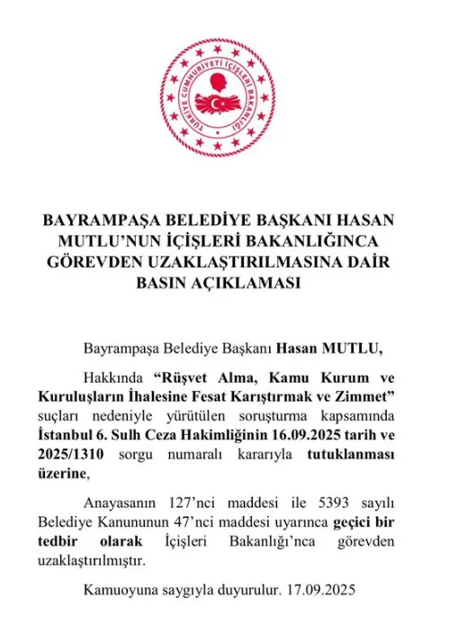 Bakanlığın sosyal medya hesabından yapılan açıklamada, “Bayrampaşa Belediye Başkanı Hasan Mutlu, hakkında ‘rüşvet alma, kamu kurum ve kuruluşların ihalesine fesat karıştırmak ve zimmet’ suçları nedeniyle yürütülen soruşturma kapsamında İstanbul 6’ncı Sulh Ceza Hakimliğinin 16 Eylül 2025 tarih ve 2025/1310 sorgu numaralı kararıyla tutuklanması üzerine, Anayasanın 127’nci maddesi ile 5393 sayılı Belediye Kanununun 47’nci maddesi uyarınca geçici bir tedbir olarak İçişleri Bakanlığı’nca görevden uzaklaştırılmıştır” denildi.