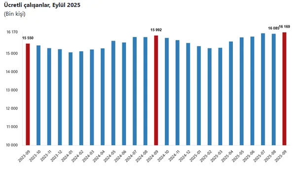 Ücretli çalışan sayısı bir önceki yılın aynı ayında 15 milyon 991 bin 589 kişi iken, 2025 yılı Eylül ayında 16 milyon 169 bin 476 kişi oldu.