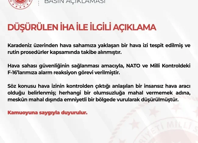 Hava sahası güvenliğinin sağlanması amacıyla NATO ve milli kontroldeki F-16’larımıza alarm reaksiyon görevi verilmiştir. Söz konusu hava izinin kontrolden çıktığı anlaşılan bir insansız hava aracı olduğu belirlenmiş; herhangi bir olumsuzluğa mahal vermemek adına meskûn mahal dışında emniyetli bir bölgede vurularak düşürülmüştür” denildi.