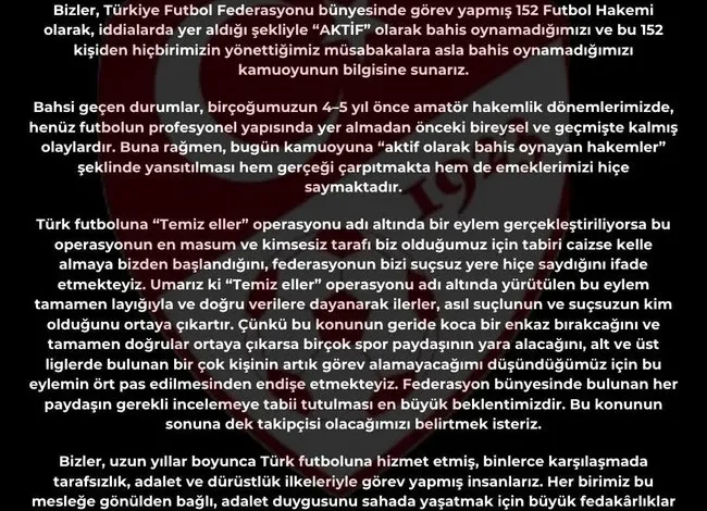 Bizler, Türkiye Futbol Federasyonu bünyesinde görev yapmış 152 Futbol Hakemi olarak, iddialarda yer aldığı şekliyle “AKTİF” olarak bahis oynamadığımızı ve bu 152 kişiden hiçbirimizin yönettiğimiz müsabakalara asla bahis oynamadığımızı kamuoyunun bilgisine sunarız. Bahsi geçen durumlar, birçoğumuzun 4-5 yıl önce amatör hakemlik dönemlerimizde, henüz futbolun profesyonel yapısında yer almadan önceki bireysel ve geçmişte kalmış olaylardır. Buna rağmen, bugün kamuoyuna “aktif olarak bahis oynayan hakemler” şeklinde yansıtılması hem gerçeği çarpıtmakta hem de emeklerimizi hiçe saymaktadır.